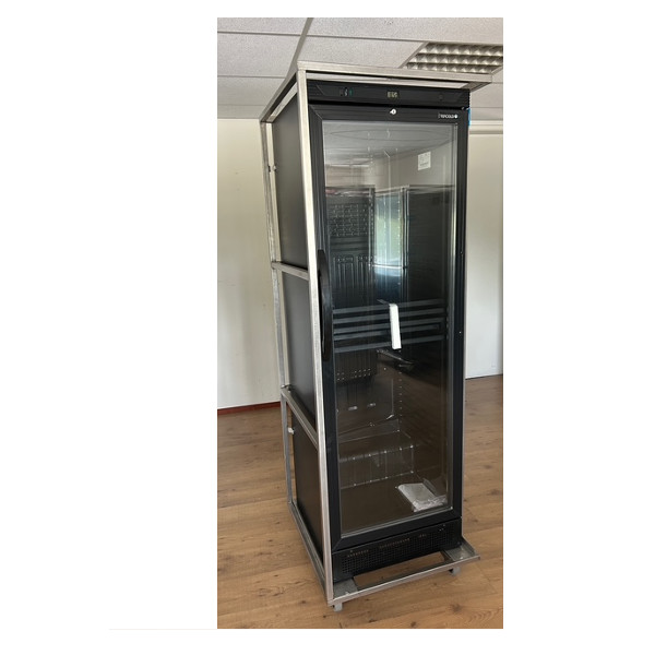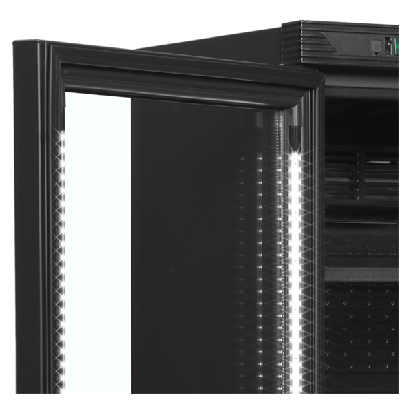De glazendeur is voorzien van ledverlichting in het deurframe, de koelkast is voorzien van 5 zwarte verstelbare legroosters, een ventilator gestuurde koeling voor een gelijkmatige temperatuur in de hele koelkast.