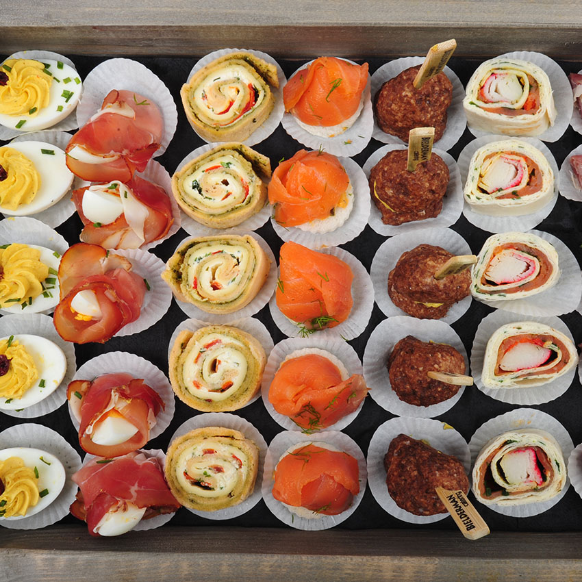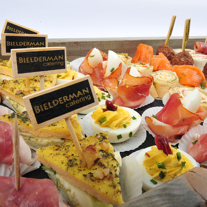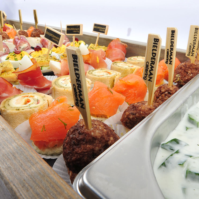 Een bonte verzameling van hapjes, gepresenteerd op een 1,5 meter lang plateau gecombineerd met diverse soorten huisgemaakte salades. Ideaal voor een verjaardag of meeting.
