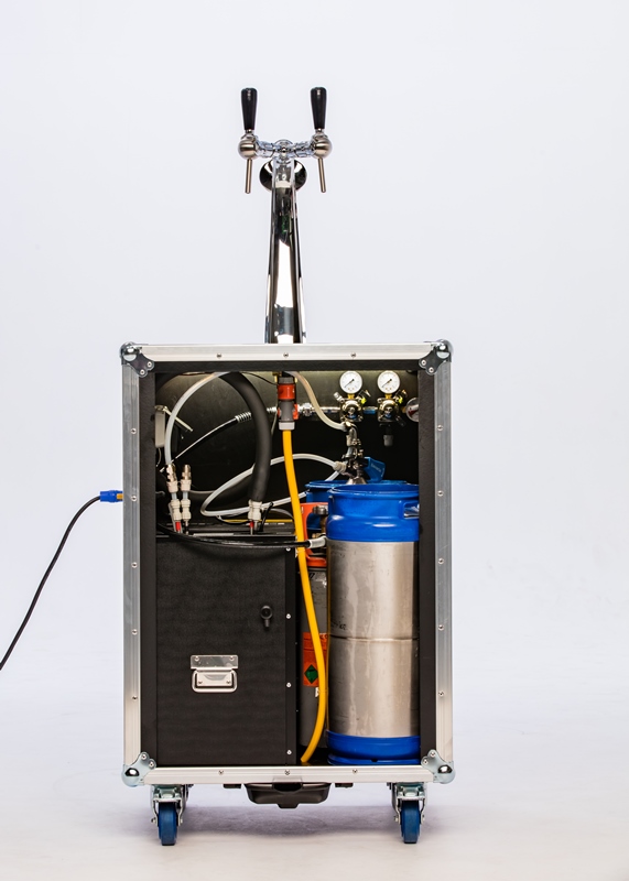 Compacte mobiele bar met een bladmaat van 650 x 500 mm in basis uitvoering. De mobiele bar is voorzien , lekgedeelte, tapzuil, compensator Pearl bierkraan, lenshouder, 12 volt adaptor, electrische aansluiting incl. twee stopcontacten HD Slang, binnen verlichting en CO-2 druk-reduceer. In de binnenzijde van de mobiele bar is plaats voor twee biervaten van 20 ltr. en een koolzuurfles van 2,5 ltr.